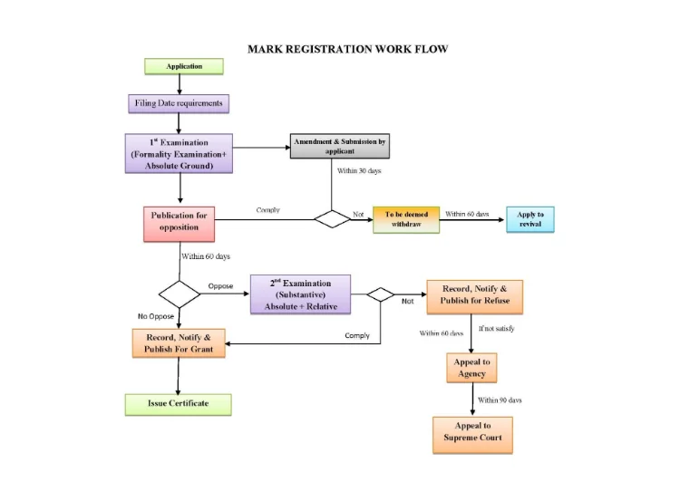 미얀마 상표 출원 절차 미얀마 상표는 출원 → 형식 심사 → 공고 → 실질 심사 → 등록결정 순서로 진행됩니다.