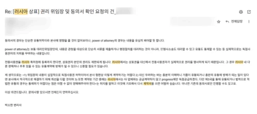 겉보기엔 통상적인 업무 대행 서류처럼 보였지만, 저희가 면밀히 검토해 보니 실상은 끔찍했습니다. 해당 위임장에는 단순히 행정 절차를 대리하는 것을 넘어, '민형사 소송 대리권'과 '유통 통제권'까지 포함되어 있었습니다. 즉, 서명하는 순간 J사는 러시아 내에서의 브랜드 독점 사용권을 총판에게 고스란히 넘겨주는 꼴이었습니다.
