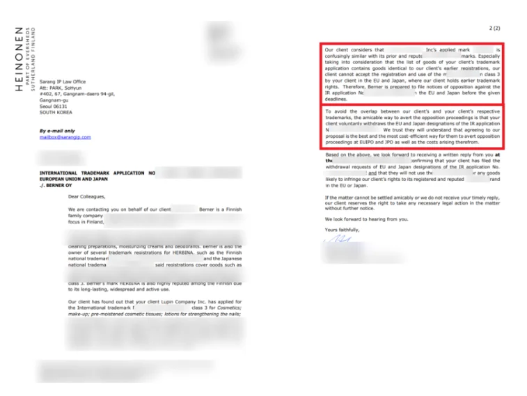 실제로 화장품 S브랜드 육대표님도 핀란드 A업체로부터 "시각적으로 유사하다, 발음이 유사하다, 유럽, 일본, 핀란드 출원을 전부 취하하라"는 공문을 받았습니다. 2020년 겨울, 얼굴이 새하얘져서 연락을 주셨던 기억이 납니다. 처음엔 포기를 고민하셨지만, 확인할 것부터 확인하자고 말씀드렸습니다.