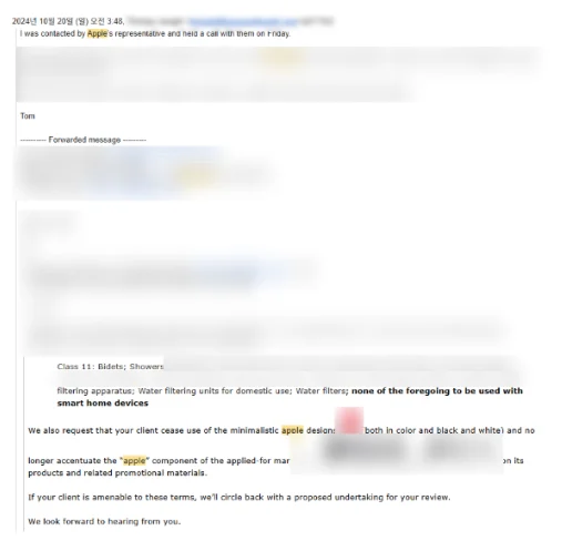 미국 상표출원 등록 중 애플에게 이의신청 예고 받은 M사 사례